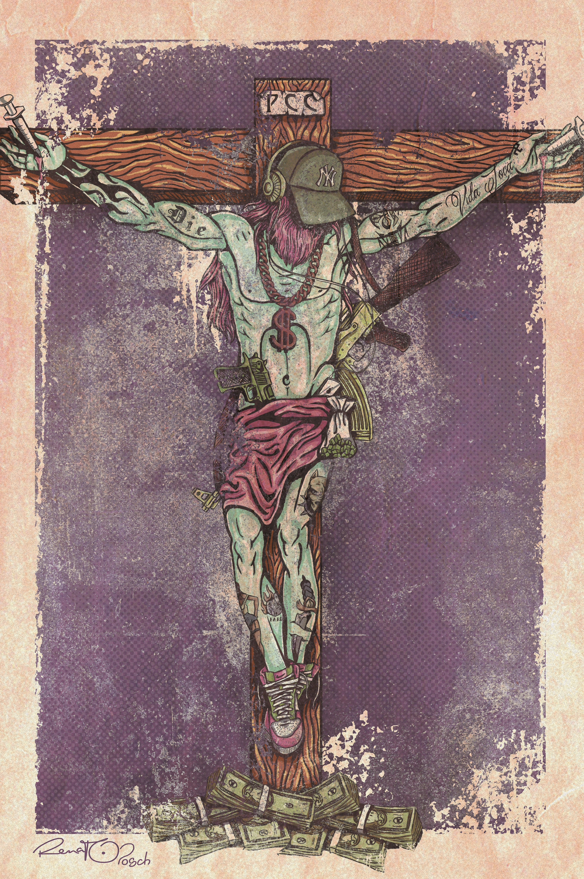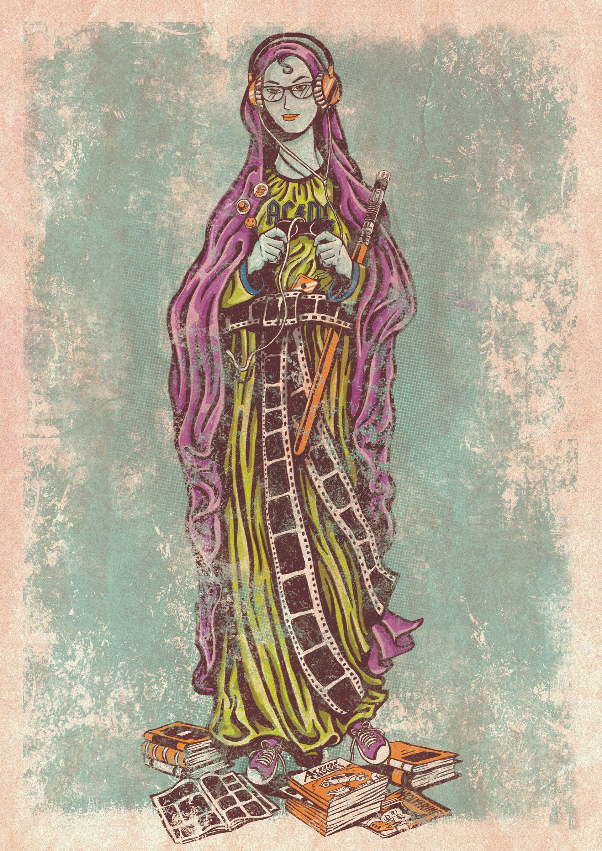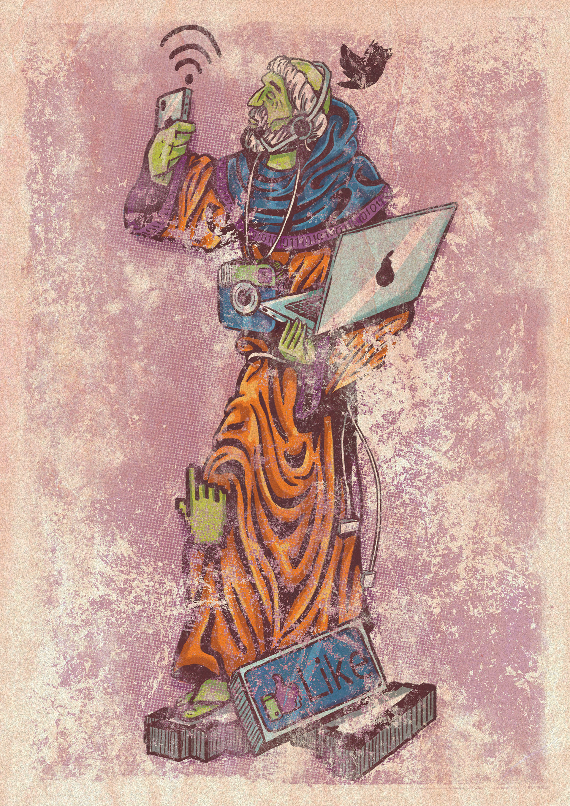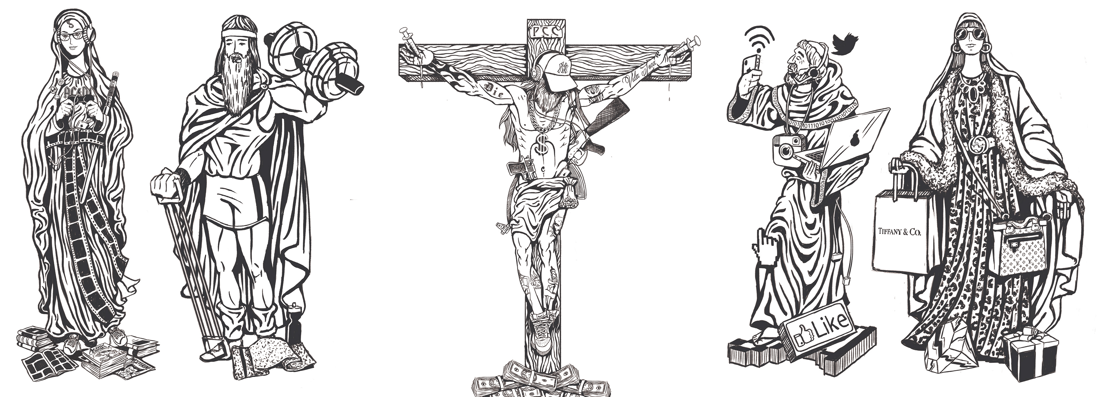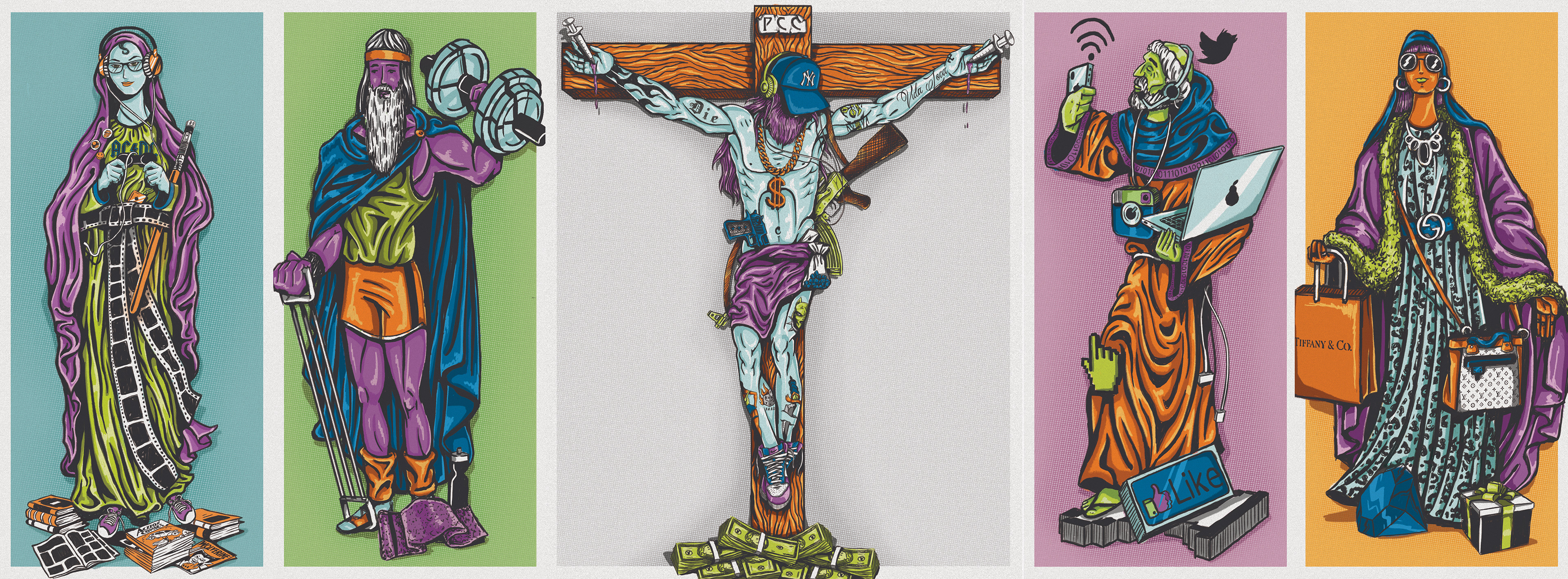 Humorous digital illustrations satirize people who put their way of life above anything else, idolizing those ways as saints of our age.